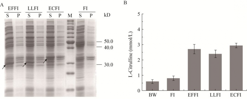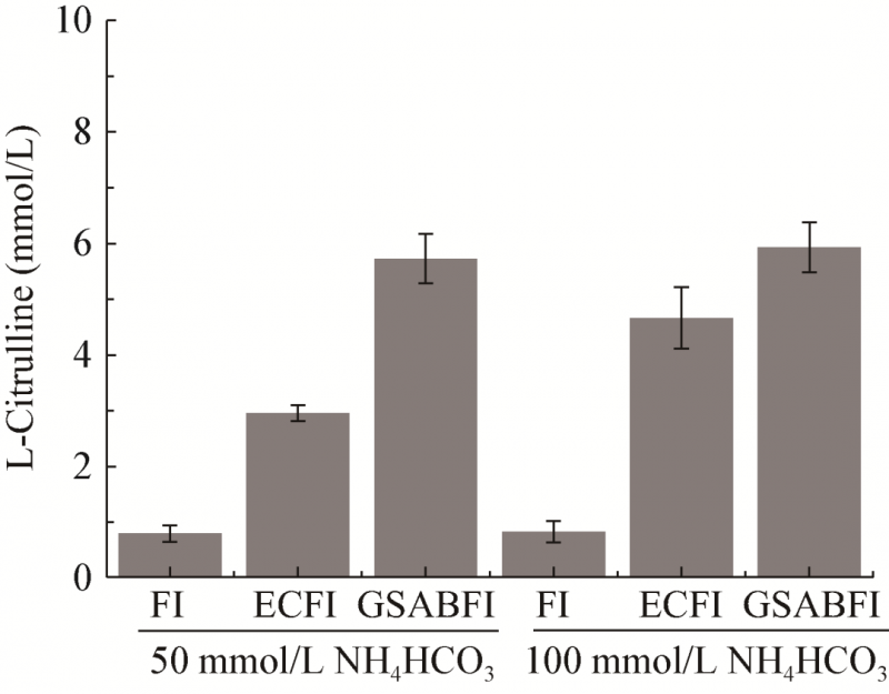 在大腸桿菌中過(guò)表達(dá)OTC,建立細(xì)胞水平氨甲酰磷酸檢測(cè)體系。在此基礎(chǔ)上比較不同來(lái)源的CK,發(fā)現(xiàn)大腸桿菌來(lái)源的CK效果最好,50 mmol/L NH4HCO3條件下全細(xì)胞催化9 h得到2.95±0.15 mmol/L L-瓜氨酸;過(guò)表達(dá)CPSⅡ時(shí),50 mmol/L L-谷氨酰胺催化9 h得到3.16±0.29 mmol/L L-瓜氨酸。通過(guò)改變底物NH4HCO3濃度和引入外源L-谷氨酰胺合成酶(GS)等方式對(duì)CK與CPSⅡ的催化反應(yīng)分別進(jìn)行優(yōu)化后,100 mmol/L NH4HCO3條件下,L-瓜氨酸濃度分別提高至4.67±0.55 mmol/L和6.12±0.38 mmol/L,且過(guò)表達(dá)GS后CPSⅡ途徑可以利用NH3,不需要額外添加L-谷氨酰胺。
