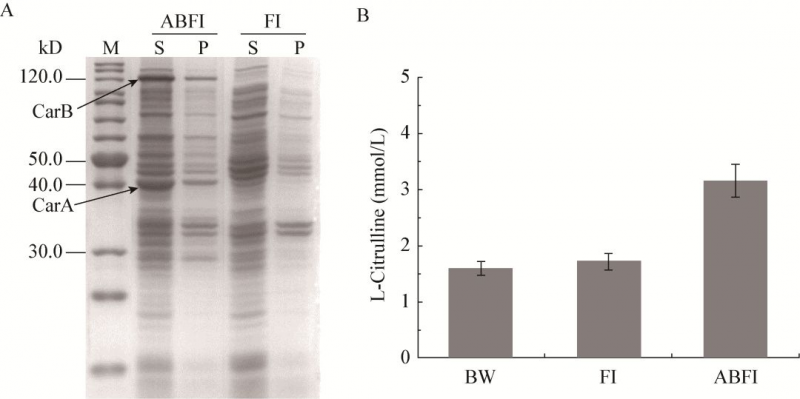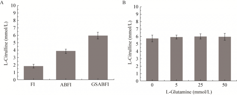 圖5引入兩岐雙岐桿菌來(lái)源GS對(duì)CPSⅡ途徑的影響(A),以及降低L-谷氨酰胺添加量對(duì)菌株GSABFI的影響(B)