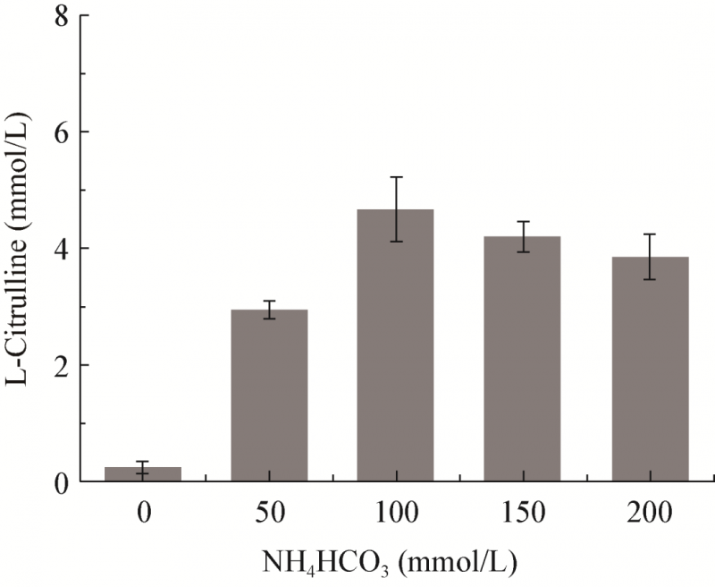 圖4 NH4HCO3濃度對(duì)菌株ECFI合成氨甲酰磷酸的影響